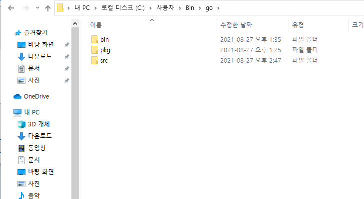 1번 설치 과정을 거치면 사용자 변수에 기본 워크스페이스 경로가 설정된다. 하지만 해당 경로에는 go 디렉토리가 없으므로 이를 생성해준다. go 디렉토리 생성후 아래와 같이 하위디렉토리들을 생성한다.